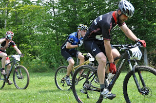 The field was small so at the start I marked who I thought would be my main competitors. My buddy Kevin who is a good rider and did much better in practice than me, a couple of locals who looked young and fast and a new to me Bikeman.com expert racer, John. At the start of the first mtb lap I sprinted to the front so that I could enter the single track first and set my own pace. This wasn't easy since the opener was a 150 yd paved road section but I got my blender on in my 32/18 and dove into the single track first.